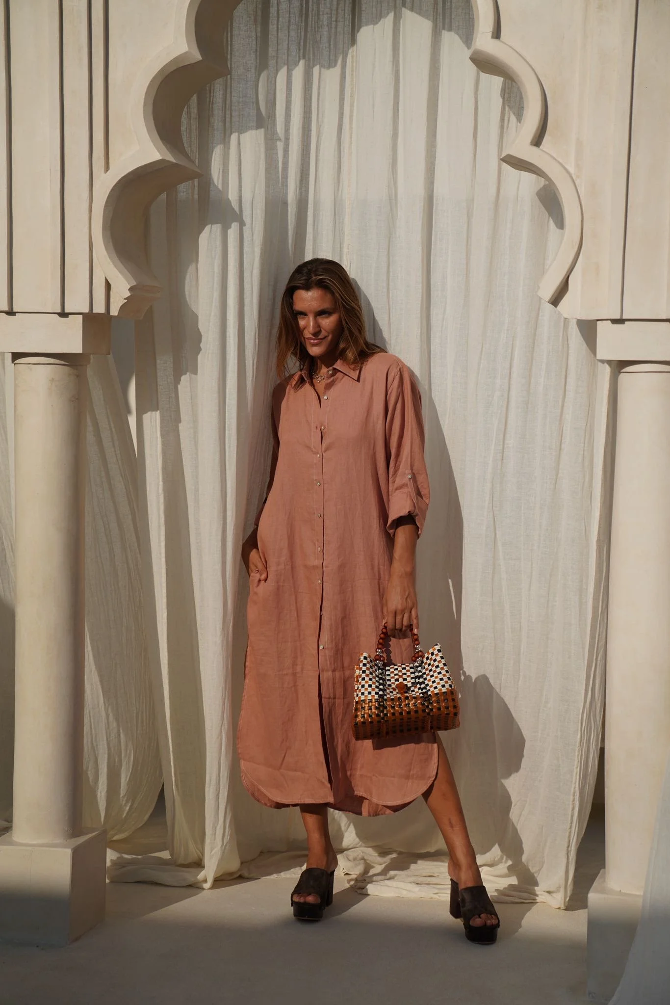 The Maggie is an effortless, casual yet classy dress perfect for days where you need to cover up from the sun and keep cool. This style features unique, contrast stitching, clean, crisp lines with a collared, button down look. The rounded hem softens the cut into your leg line, and side slits help further expose that leg line.