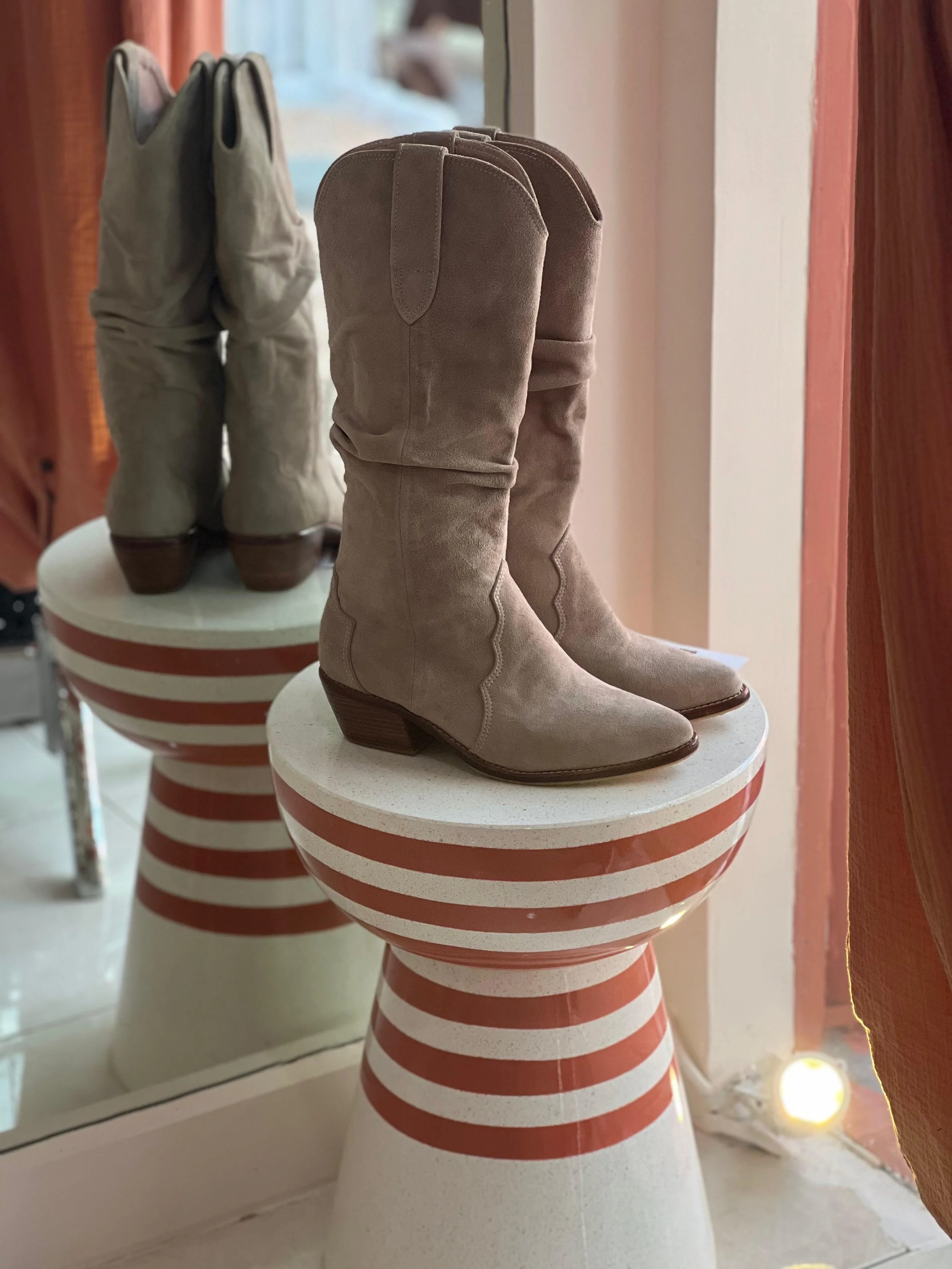 Slouchy, bohemian, slip-on boots. Featuring a 5cm heel, mid-calf rise, V-tapered top and tabs either side to add character.